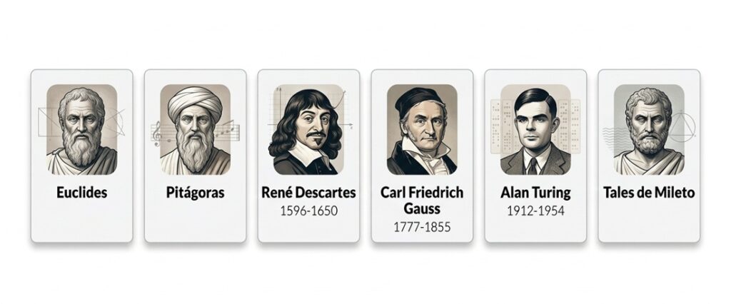 Euclides, Pitágoras, René Descartes, Carl Friedrich Gauss, Alan Turing y Tales de Mileto: Gigantes de la matemática que moldearon el pensamiento humano desde la Antigua Grecia hasta el siglo XX.